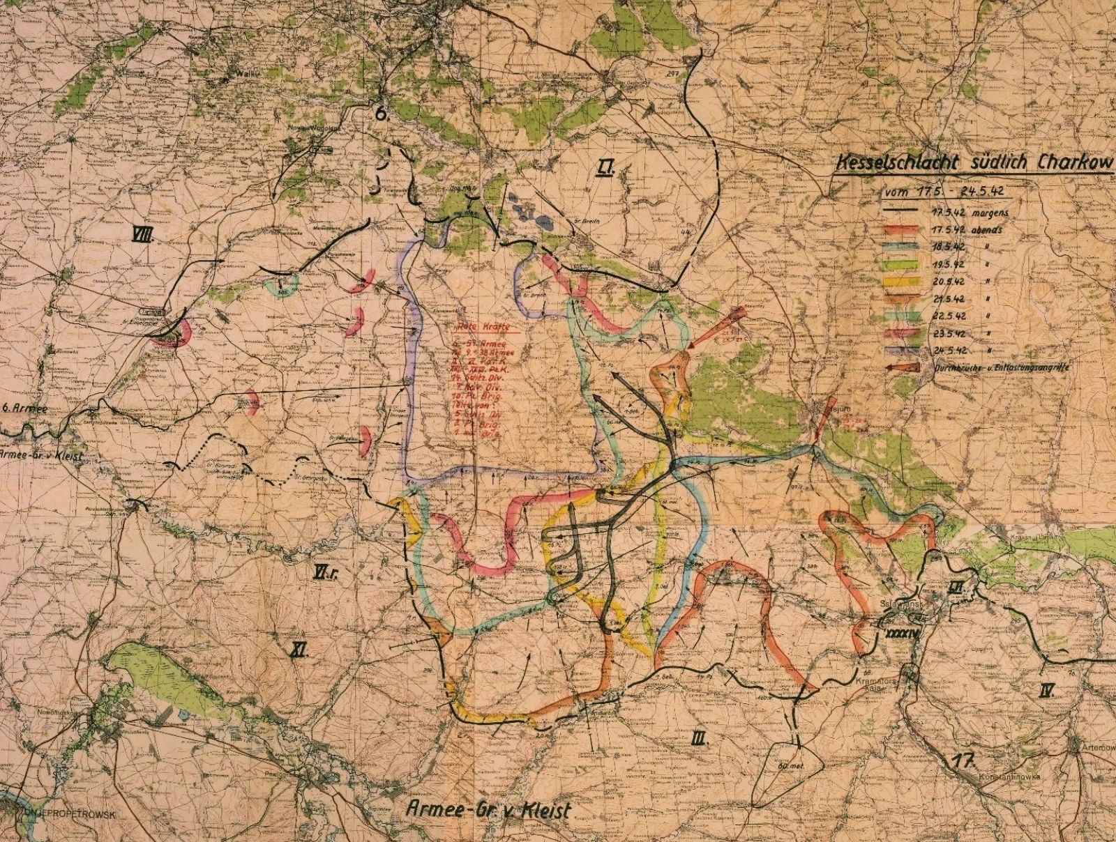 The collection documents the Soviet offensive south of Kharkov, the German counter-stroke, and the rapid encirclement and destruction of Soviet forces in the Barvenkovo salient—one of Germany’s last major operational victories before Operation Blau and Stalingrad. The maps clearly illustrate manoeuvre warfare, pocket formation, command decisions, and the collapse of formations under encirclement pressure, making them especially valuable for understanding Eastern Front operational doctrine.